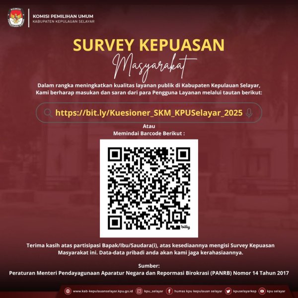 Caranya mudah, cukup isi kuesioner melalui link berikut atau pindai barcode pada gambar https://bit.ly/Kuesioner_SKM_KPUSelayar_2025 Kami menjamin kerahasiaan data pribadi Anda.