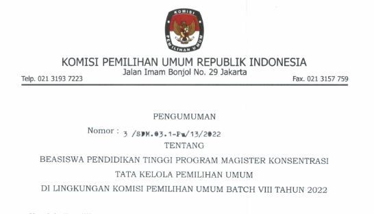 Komisi Pemilihan Umum Republik Indonesia kembali membuka Pedaftaran Beasiswa Pendidikan Magister (S2) Konsentrasi Tata Kelola Pemilu di 12 Perguruan Tinggi Negeri yang ada di Indonesia. Keterangan lebih lanjut silahkan Klik ini