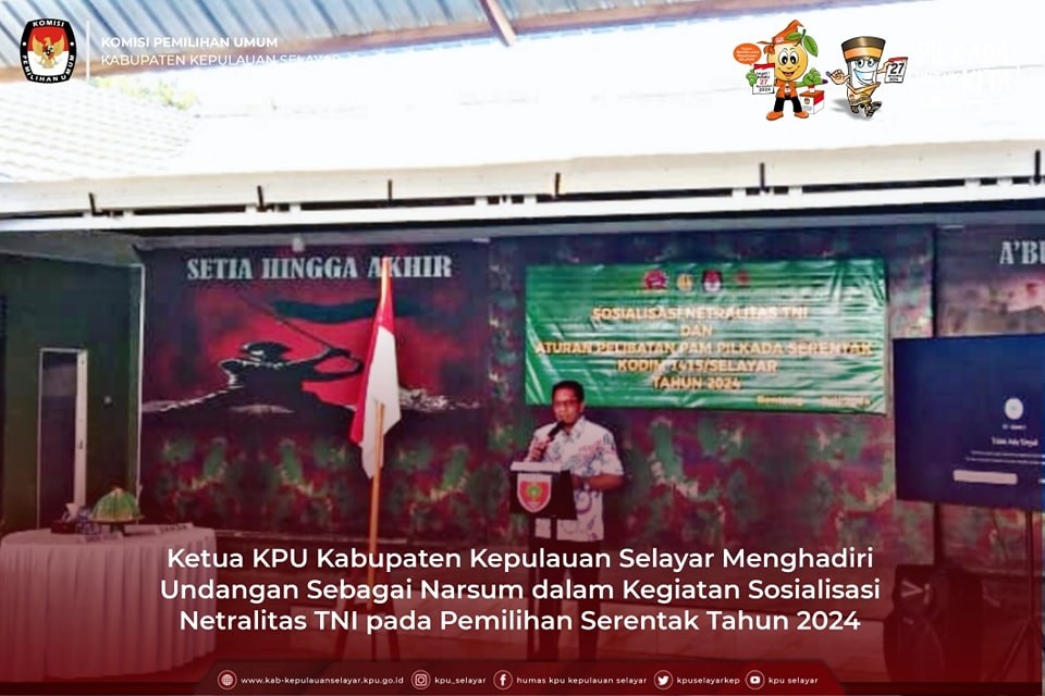 Ketua Komisi Pemilihan Umum (KPU) Kabupaten Kepulauan Selayar, Andi Dewantara, diundang sebagai narasumber dalam kegiatan sosialisasi netralitas TNI dan aturan Pelibatan Pam Pilkada serentak tahun 2024 yang diselenggarakan oleh Kodim 1415/Selayar di Aula Makodim 1415/Selayar. Acara tersebut dihadiri oleh seluruh jajaran anggota TNI-AD se Kabupaten Kepulauan Selayar. Rabu (17/07/24).