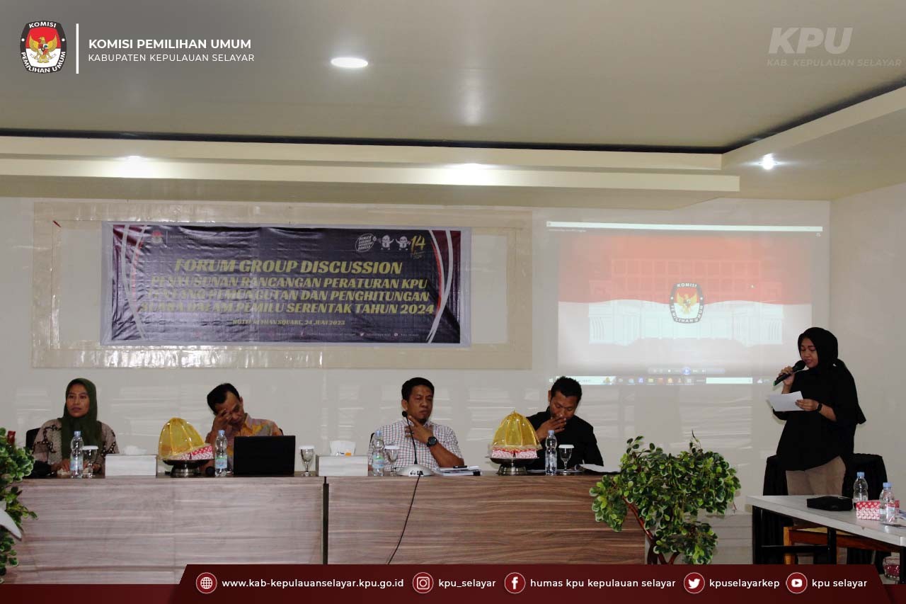 Komisi Pemilihan Umum (KPU) Kabupaten Kepulauan Selayar menggelar Focus Group Discussion (FGD) terkait rancangan Peraturan KPU tentang Pemungutan dan Penghitungan Suara Pemilihan Umum (Pemilu) Tahun 2024. FGD ini melibatkan berbagai pihak terkait.Sabtu (24/6)