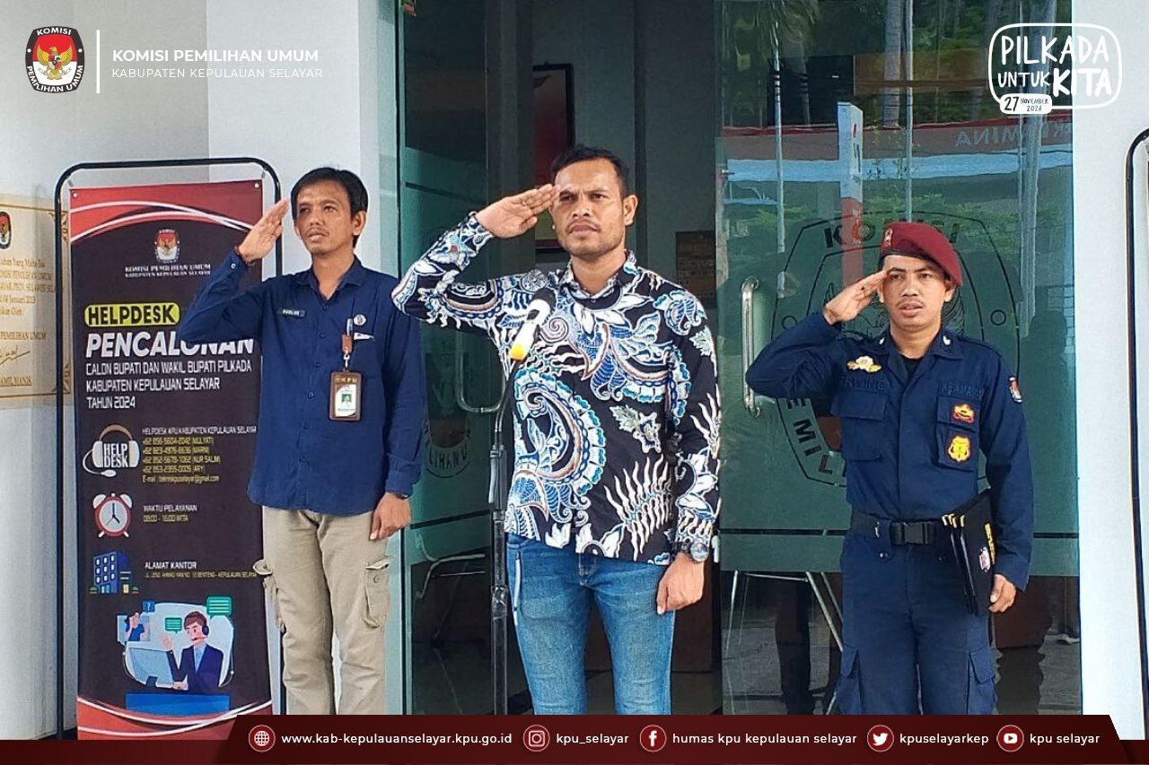 #TemanPemilih, Dalam rangka memperingati Hari Lahir Pancasila, Komisi Pemilihan Umum (KPU) Kabupaten Kepulauan Selayar menyelenggarakan upacara di halaman kantor KPU Kabupaten Kepulauan Selayar. Acara ini dipimpin oleh Muhamad Arsat, anggota KPU Kabupaten Kepulauan Selayar sebagai Inspektur Upacara, dan Frelly Armansyah, staf pelaksana Subbagian Hukum dan SDM, sebagai pimpinan upacara. Sabtu (1/6/24).