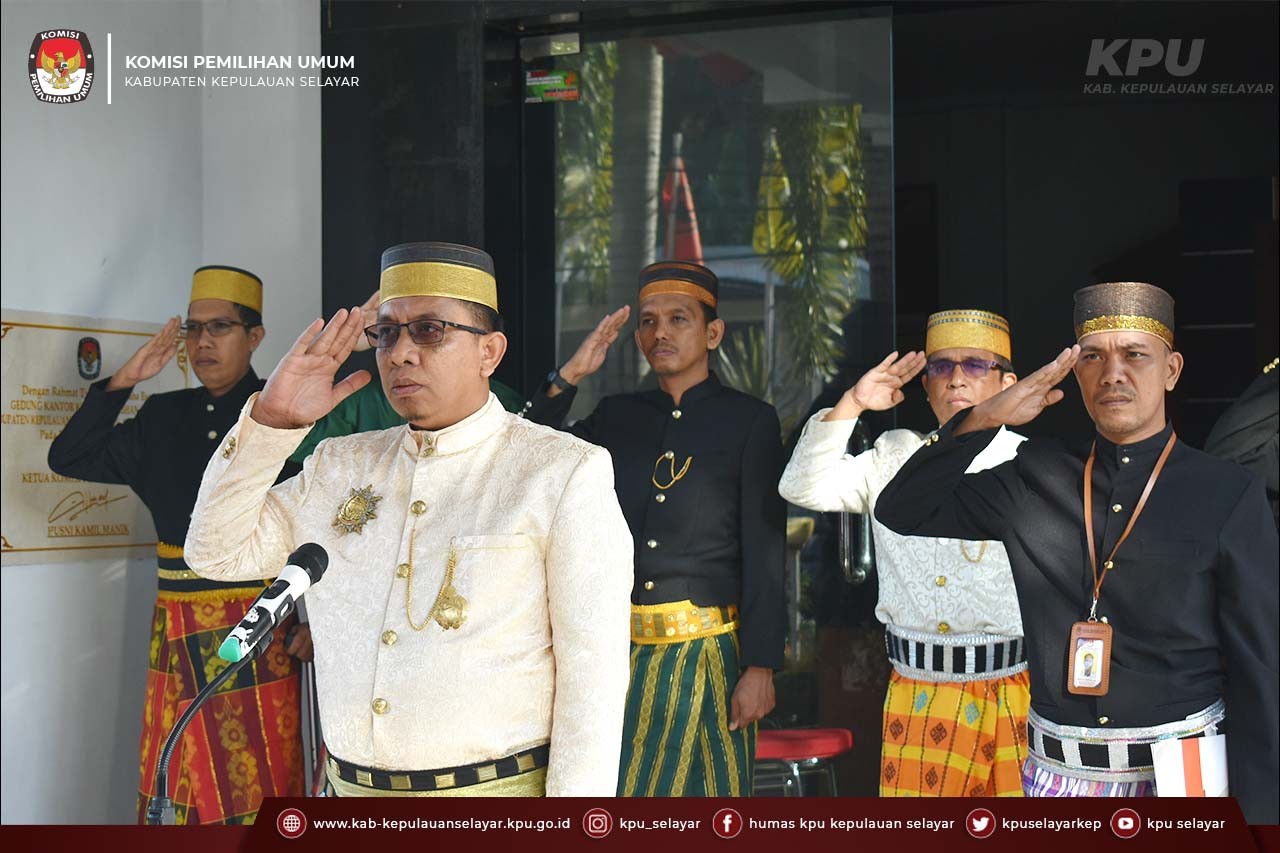 Dalam pelaksanaannya peserta dan pemimpin upacara menggunakan pakaian adat. Bertindak sebagai pemimpin upacara Kasubag KUL KPU kabupaten Kepulauan Selayar Andi Usman dan inspektur upacara, Ketua KPU Kabupaten Kepulauan Selayar, Andi Dewantara. Sedangkan petugas Pengibar bendera dari Jagatsaksana, KPU Kabupaten Kepulauan Selayar, Andi Erwing, Mahyudin dan Andi Nasrum.
