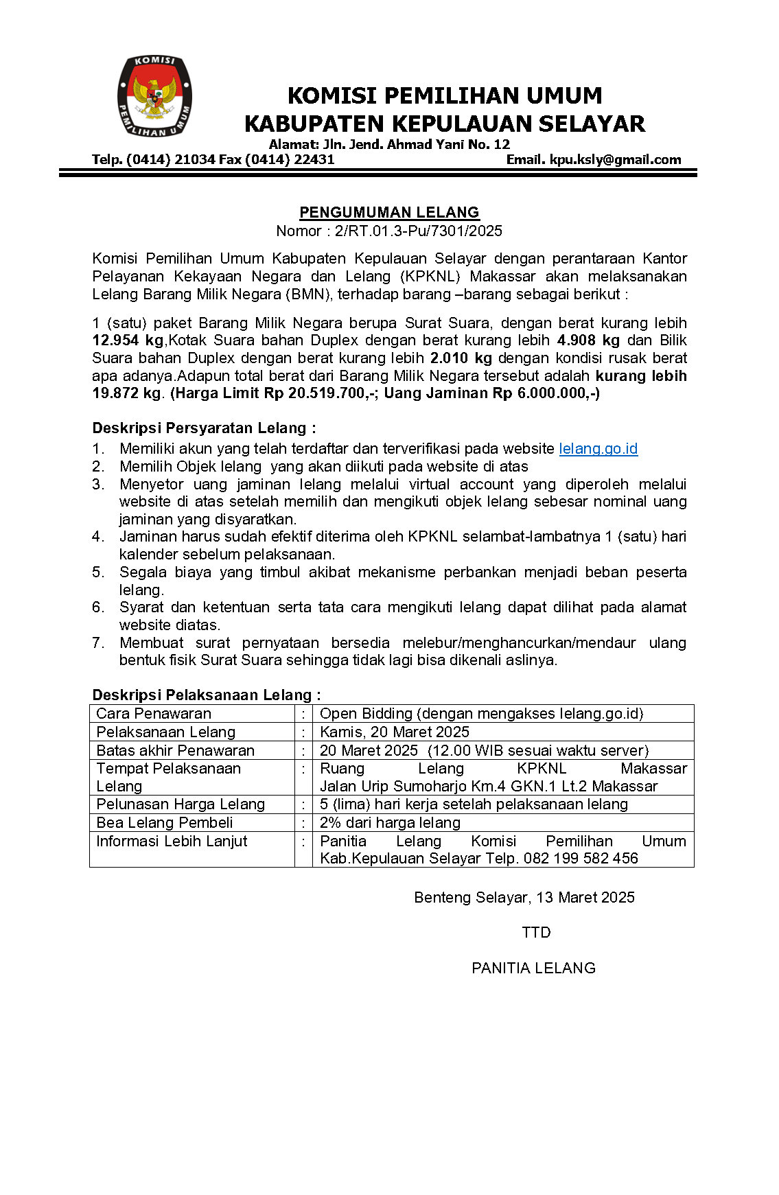 Informasi Lebih Lanjut: Panitia Lelang Komisi Pemilihan Umum Kabupaten Kepulauan Selayar Telp. 082 199 582 456