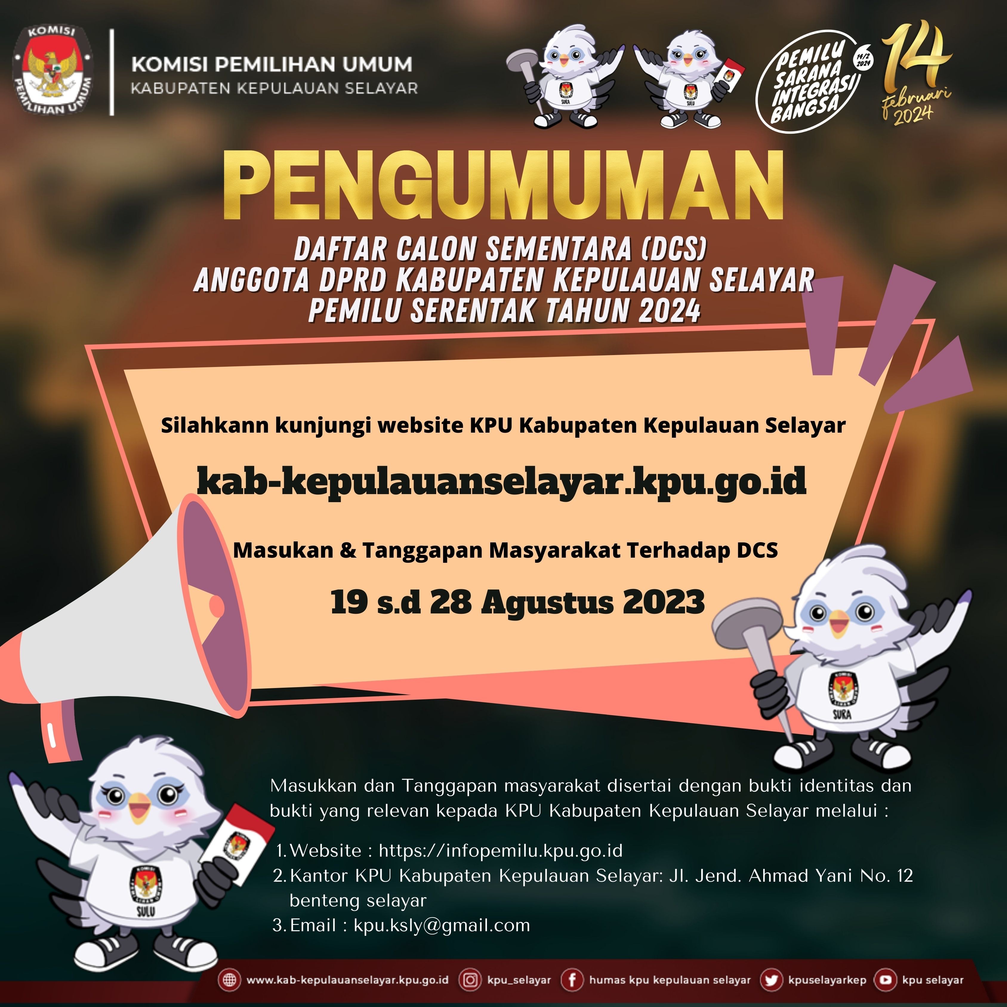 Berikut Kami sampaikan Pengumuman KPU Kabupaten Kepulauan Selayar nomor 09/PL.01.4-Pu/7301/2023 tentang Daftar Calon sementara Anggota DPRD Kabupaten kepulauan Selayar dalam pemilihan Umum Tahun 2024, melalui link berikut klik disini