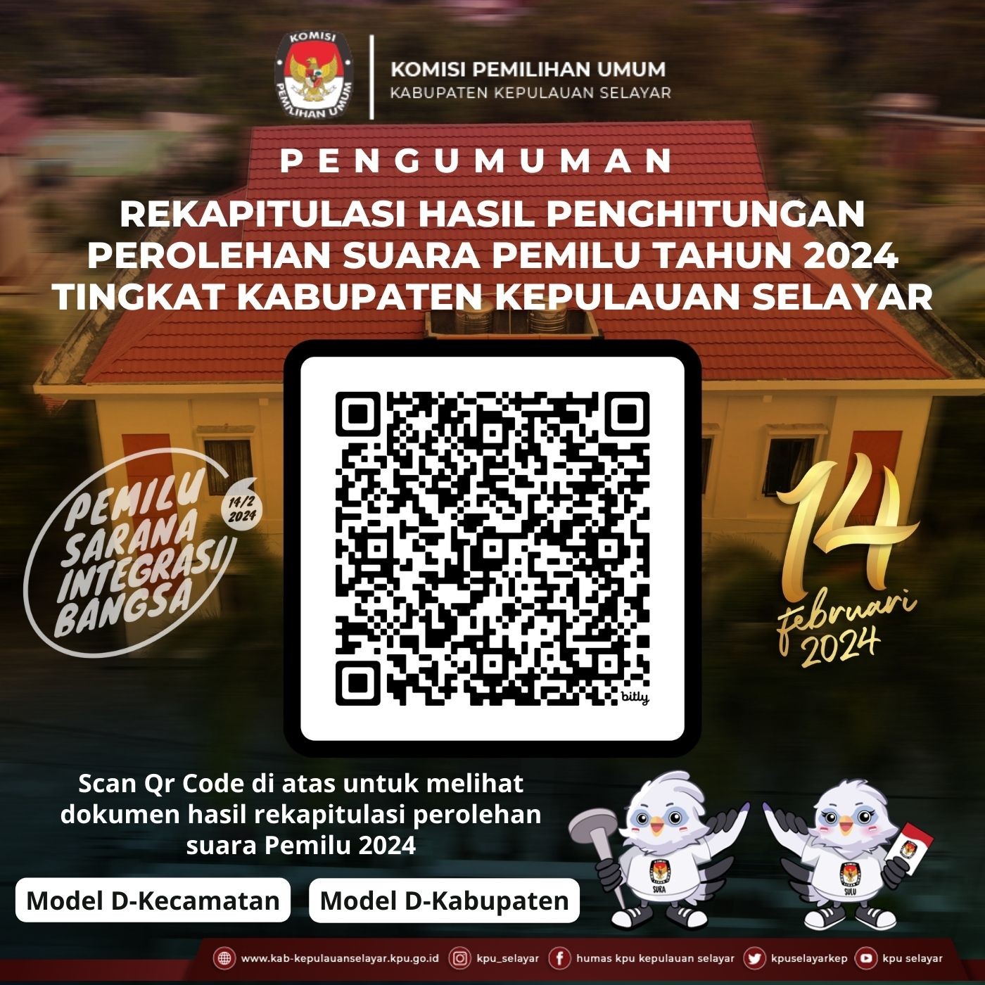 Berikut Kami sampaikan pengumuman berita acara dan sertifikat rekapitulasi hasil penghitungan perolehan suara Jenis Pemilihan PPWP, DPR RI, DPD, DPRD Provinsi dan DPRD Kabupaten ditingkat Kabupaten Kepulauan Selayar pada Pemilihan Umum Tahun 2024, yang dapat di unduh melalui qr code pada gambar atau dapat melalui link yang tertera berikut ini klik disini