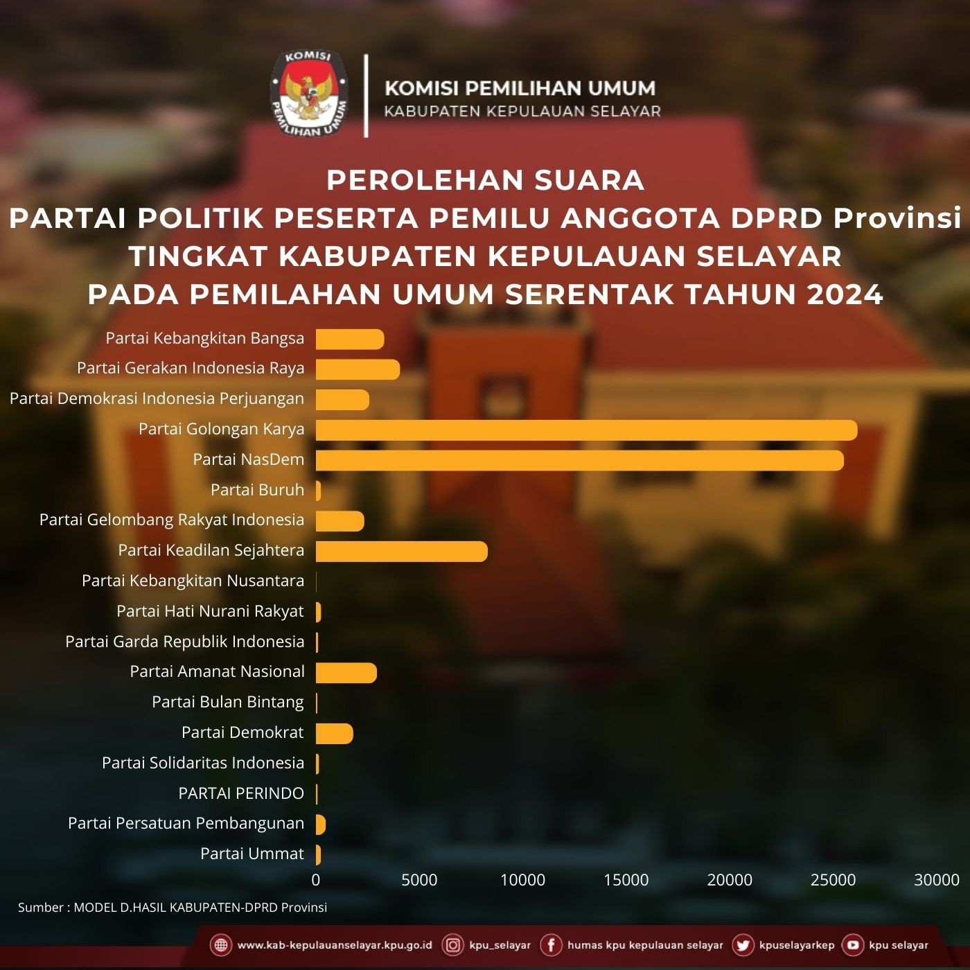 Berikut kami sampaikan infografik Perolehan Suara Ppartai politik peserta pemilu anggota DPRD Provinsi ditingkat Kabupaten Kepulauan Selayar pada pemilihan umum serentak tahun 2024