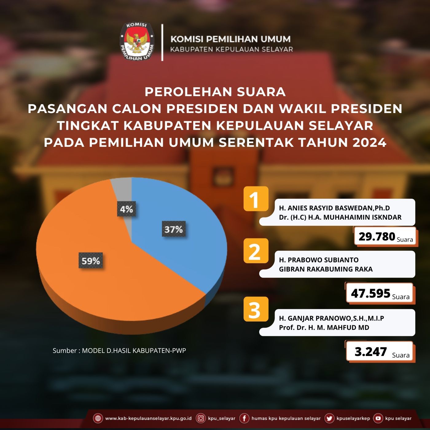 Berikut kami sampaikan infografik Perolehan Suara Pasangan Calon Persiden dan Wakil Peresiden tingkat Kabupaten Kepulauan Selayar pada pemilihan umum serentak tahun 2024