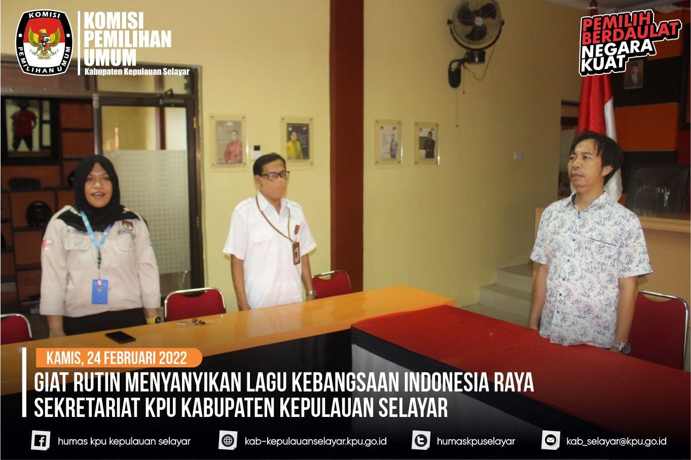 Benteng, Sekretariat KPU Kabupaten Kepulauan Selayar hari ini, Kamis (24/2/22) kembali melaksanakan giat rutin menyanyikan lagu Kebangsaan Indonesia Raya. Giat yang bertempat di RPP Tanadoang ini merupaka agenda rutin di jajaran KPU setiap minggunya yang dilaksanakan pada hari Selasa dan Kamis.