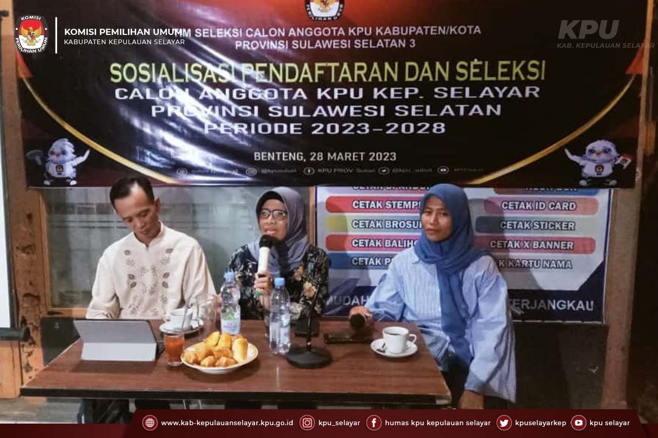 Tim Seleksi Calon Anggota KPU Kabupaten/kota Provinsi Sulawesi Selatan 3 Periode 2023-2028 melaksanakan Sosialisasi Seleksi Calon Anggota KPU Kabupaten/kota di Warkop Kopita, Jl.Kemiri Nomor 21A, Benteng, Kec. Benteng, Kabupaten Kepulauan Selayar bertujuan untuk menjaring minat masyarakat supaya berpartisipasi dan mendaftar sebagai calon anggota KPU Kabupaten Kepulauan Selayar periode 2023-2028. Selasa (28/3/2023).