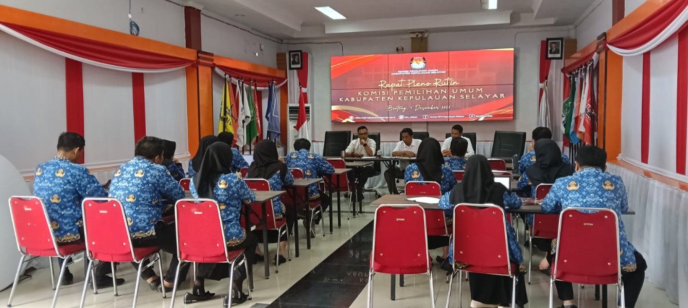 Kepulauan Selayar – Komisi Pemilihan Umum (KPU) Kabupaten Kepulauan Selayar menggelar Rapat Pleno Rutin di Rumah Pintar Pemilu (RPP) Kantor KPU Kepulauan Selayar, Rabu (10/12/2025). Rapat yang dimulai pukul 10.00 WITA ini dipimpin langsung oleh Ketua KPU Kabupaten Kepulauan Selayar, Andi Dewantara, serta dihadiri oleh jajaran Anggota KPU, Sekretaris, para Kepala Sub Bagian (Kasubag), Pejabat Fungsional, dan staf pelaksana. Agenda pleno kali ini membahas tiga isu strategis, yakni evaluasi progres kegiatan mingguan, laporan pencermatan inventarisasi Sistem Informasi Manajemen dan Akuntansi Barang Milik Negara (SIMAK BMN), serta persiapan pelaksanaan Rapat Koordinasi Kearsipan. Dalam arahannya, Ketua KPU Kepulauan Selayar, Andi Dewantara menekankan pentingnya pleno ini untuk memastikan seluruh agenda lembaga berjalan sesuai rencana tanpa kendala teknis. "Selain menindaklanjuti evaluasi kegiatan sebelumnya dan pencermatan aset BMN, hari ini kita fokus mematangkan persiapan Rapat Koordinasi Kearsipan yang akan kita laksanakan besok," ujar Andi Dewantara. Pembahasan persiapan Rakor Kearsipan menjadi atensi khusus mengingat kegiatan tersebut akan melibatkan pihak eksternal. Sesuai jadwal, Rakor yang akan digelar pada Kamis (11/12/2025) tersebut akan menghadirkan narasumber dari Dinas Perpustakaan dan Kearsipan Kabupaten Kepulauan Selayar serta tim dari KPU Provinsi Sulawesi Selatan. "Kita harus memastikan kesiapan teknis untuk acara besok, mulai dari materi tata kelola kearsipan pasca pemilu hingga pendampingan aplikasi SRIKANDI. Pengelolaan arsip yang baik adalah bagian vital dari akuntabilitas lembaga kita," tambahnya. Sementara itu, terkait inventarisasi SIMAK BMN, forum menyepakati perlunya ketelitian dalam pencatatan aset demi terwujudnya tertib administrasi yang transparan dan akuntabel. Melalui konsolidasi rutin ini, KPU Kepulauan Selayar berkomitmen untuk terus menjaga soliditas internal dan profesionalisme dalam menjalankan setiap tahapan kegiatan maupun pelayanan perkantoran.